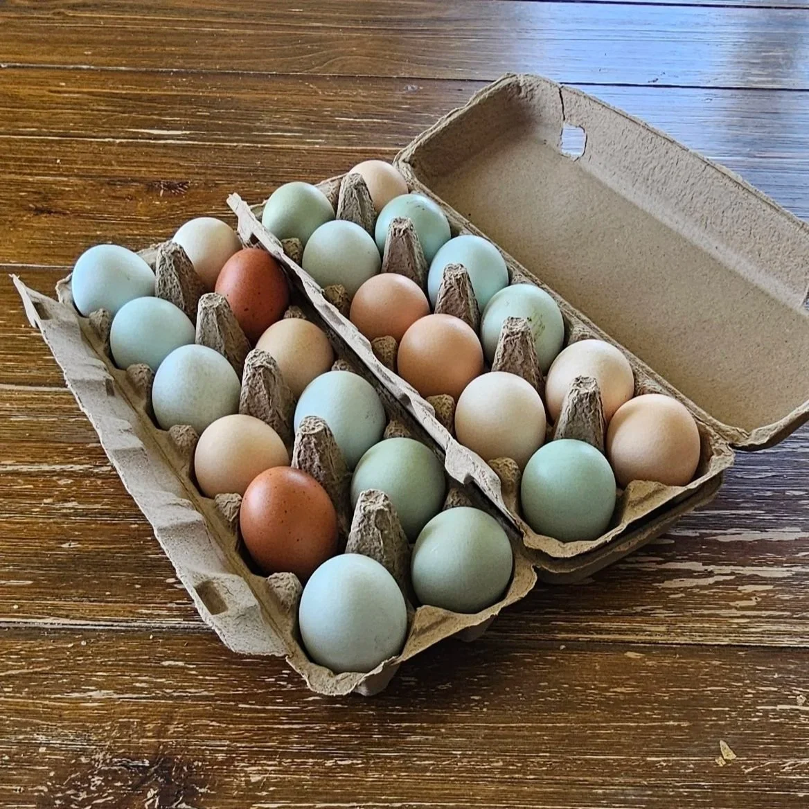 We offer fertilized hatching eggs from our Whiting True Blue roosters over our diverse laying flock. These crosses produce colorful backyard birds with blue, green, olive, brown, and speckled egg potential.